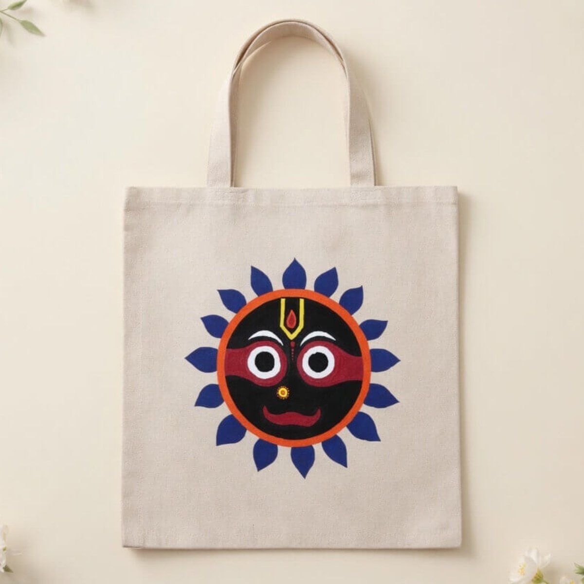 This eco-friendly cotton tote bag features a vibrant traditional Jagannath-inspired design, making it perfect for daily use, gifting, or religious occasions. Made from durable cotton fabric, this reusable bag is lightweight, washable, and environmentally friendly.