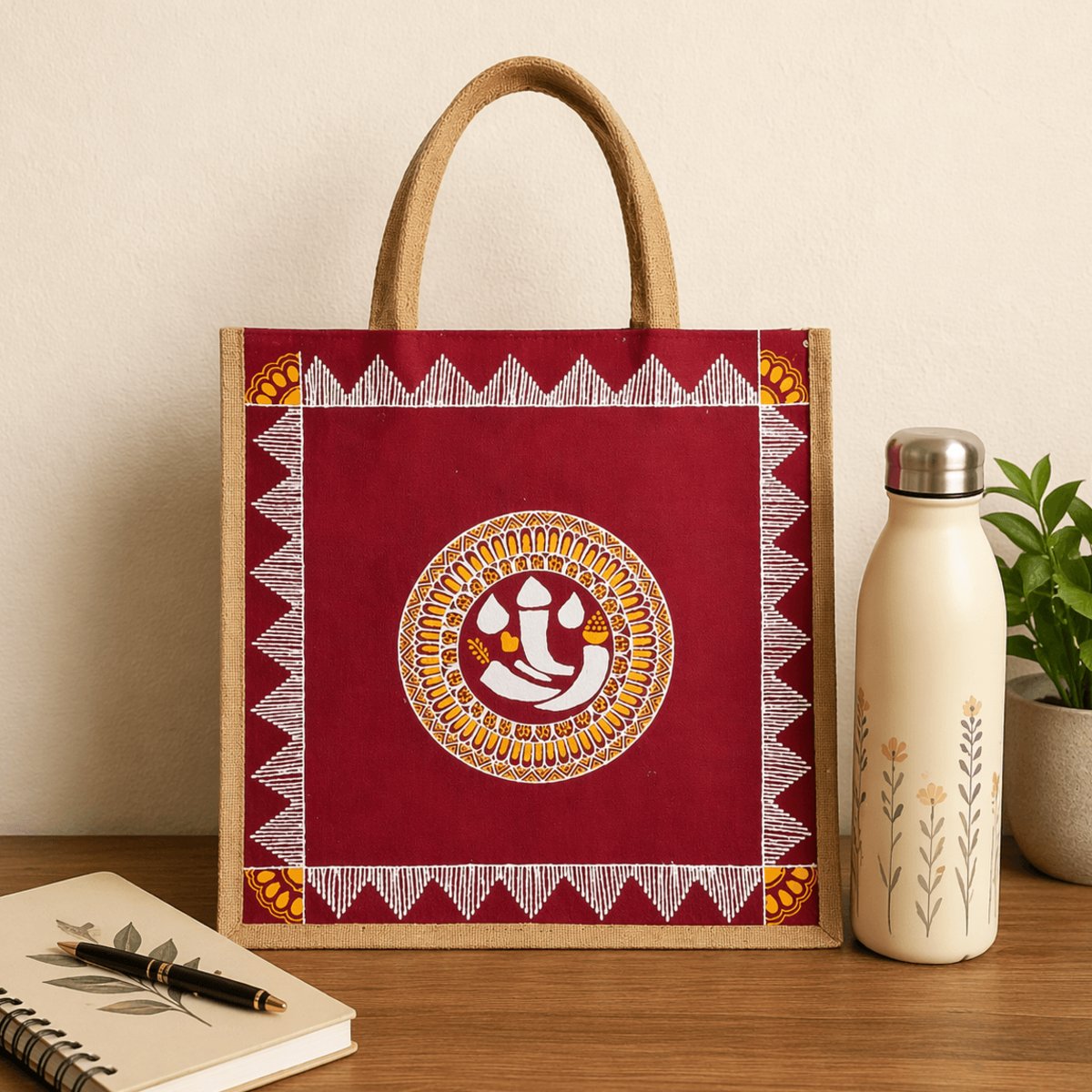 Bring home the elegance of traditional Aipan Art with this beautifully handcrafted Ganesh design jute tote bag. The bag features a sacred Lord Ganesh motif created in authentic Aipan folk art style, symbolizing prosperity, wisdom, and good fortune. Made from durable jute material, this eco-friendly bag is perfect for daily use, shopping, gifting, office, or festive occasions.