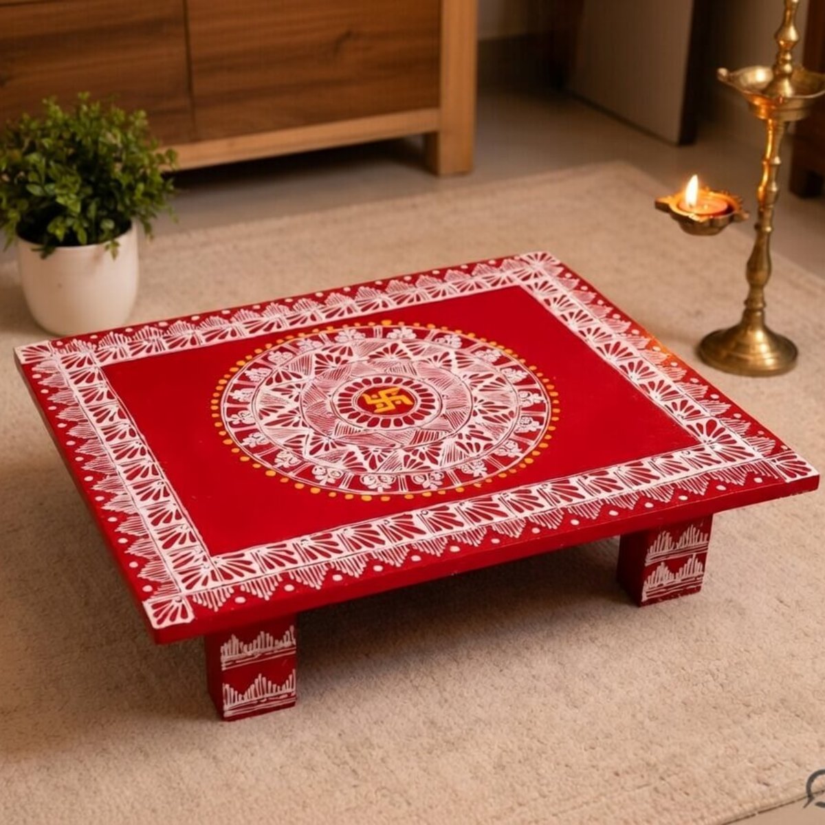 Iska vibrant red base aur detailed artwork aapke ghar ko ek traditional aur premium touch deta hai. Ye chowki sirf pooja ke liye nahi, balki ek beautiful home decor piece bhi hai.