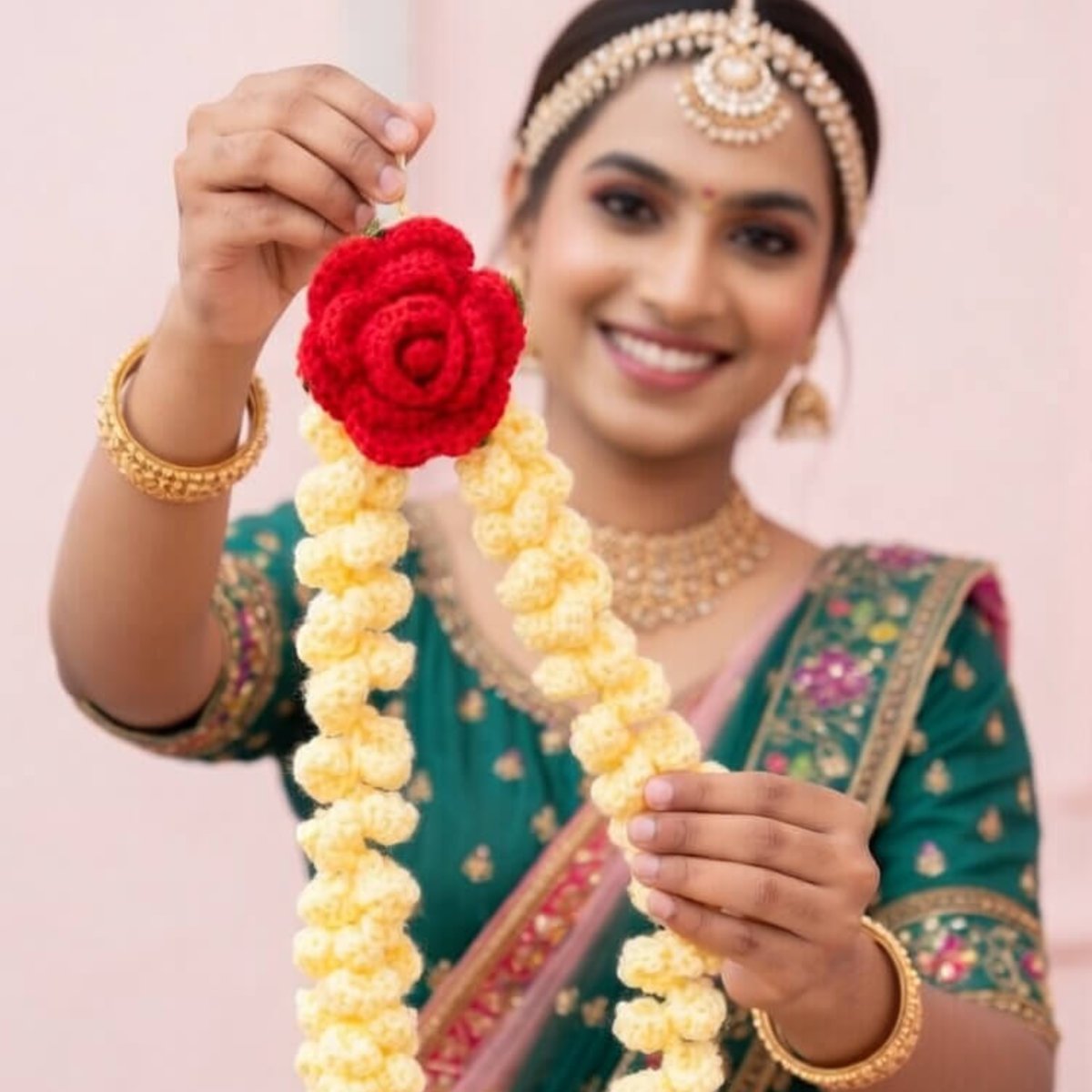 Upgrade your hairstyle with this beautifully handcrafted Crochet Rose Hair Accessory with Floral Hanging Gajra. Designed with a stunning red crochet rose and soft floral strings, it adds a graceful and eye-catching look to your ponytail or open hairstyle.
