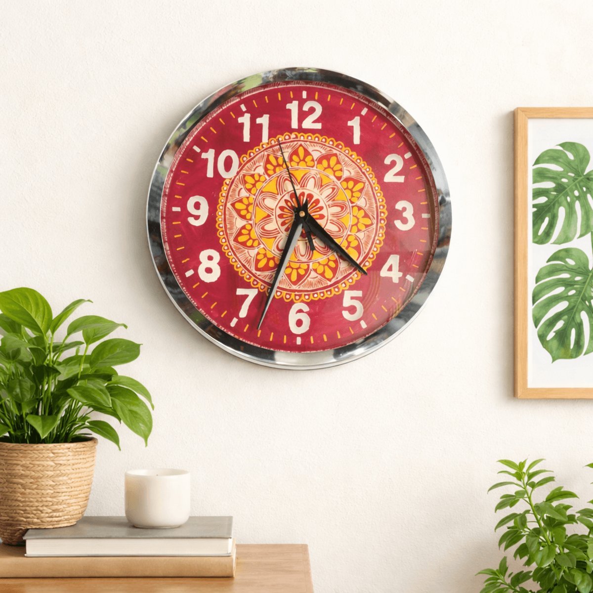 Bring home the charm of traditional Kumaoni art with this beautifully crafted Pahadi Aipan Art Wall Clock. Featuring a vibrant red base with intricate hand-painted mandala patterns, this clock adds a cultural and artistic touch to your living space.