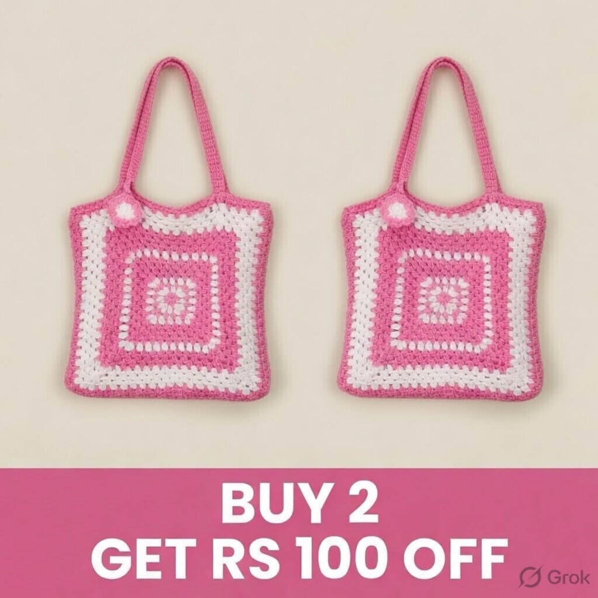 Stylish aur handmade pink crochet tote bag jo daily use aur fashion dono ke liye perfect hai. Iska soft crochet design aur attractive pink-white color combination ise unique look deta hai. Shopping, college, travel ya casual outing ke liye best choice hai. Spacious design ke saath yeh lightweight aur comfortable carry bag hai.