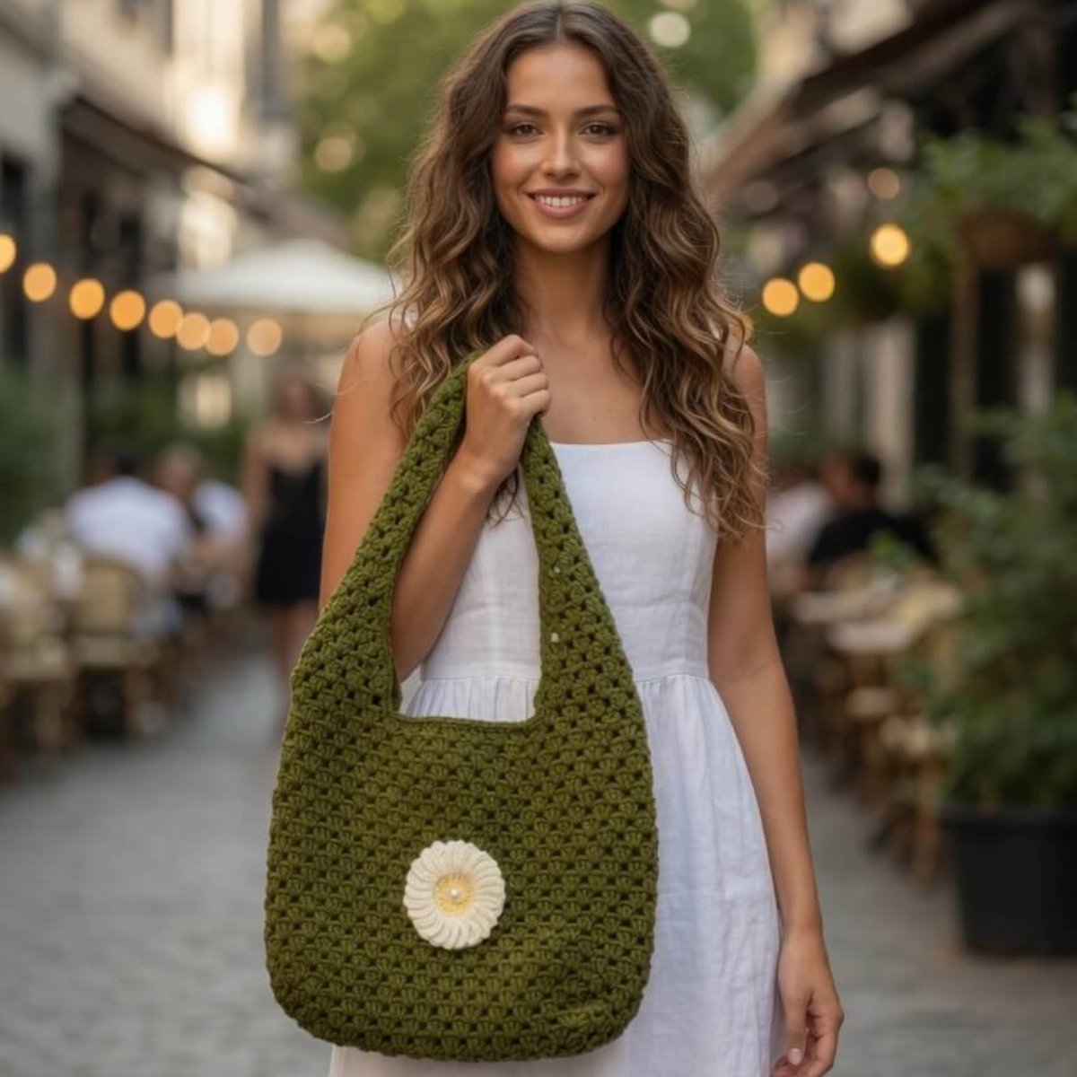 Stylish handmade crochet tote bag designed with high-quality soft yarn in a beautiful olive green color. This elegant tote bag features a lovely flower detail on the front, giving it a unique handmade look. It is lightweight, durable, and spacious enough to carry daily essentials like phone, wallet, cosmetics, books, and small accessories.