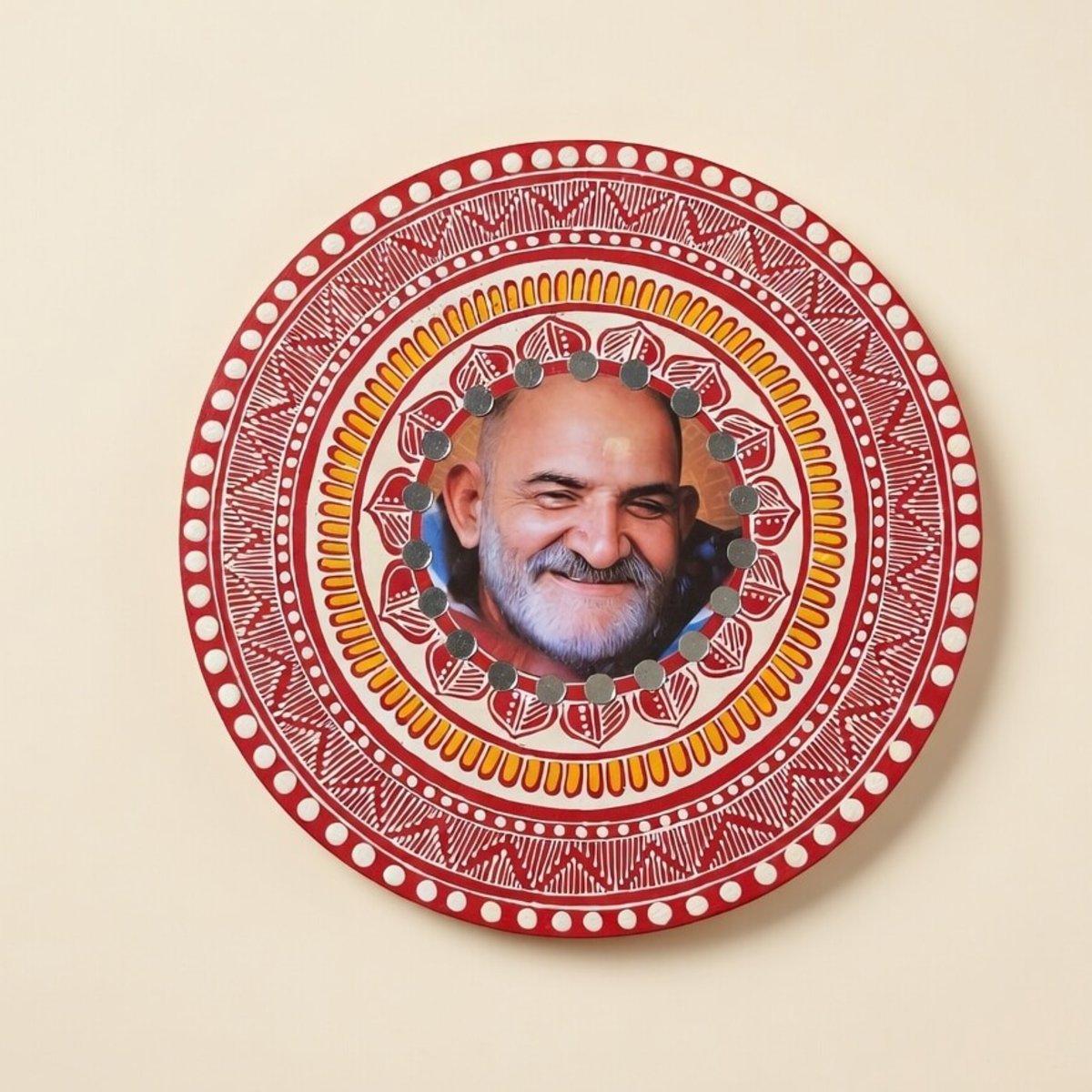 Beautiful traditional handcrafted Photo Aipan Wall frame in red mandala design. This 27.94 cm (11 inch) round decorative plate comes with strong magnets to hold your favorite photo perfectly. Ideal for home wall decor, gifting to loved ones, or preserving memories. Handcrafted ethnic look that blends Indian folk art with modern utility.