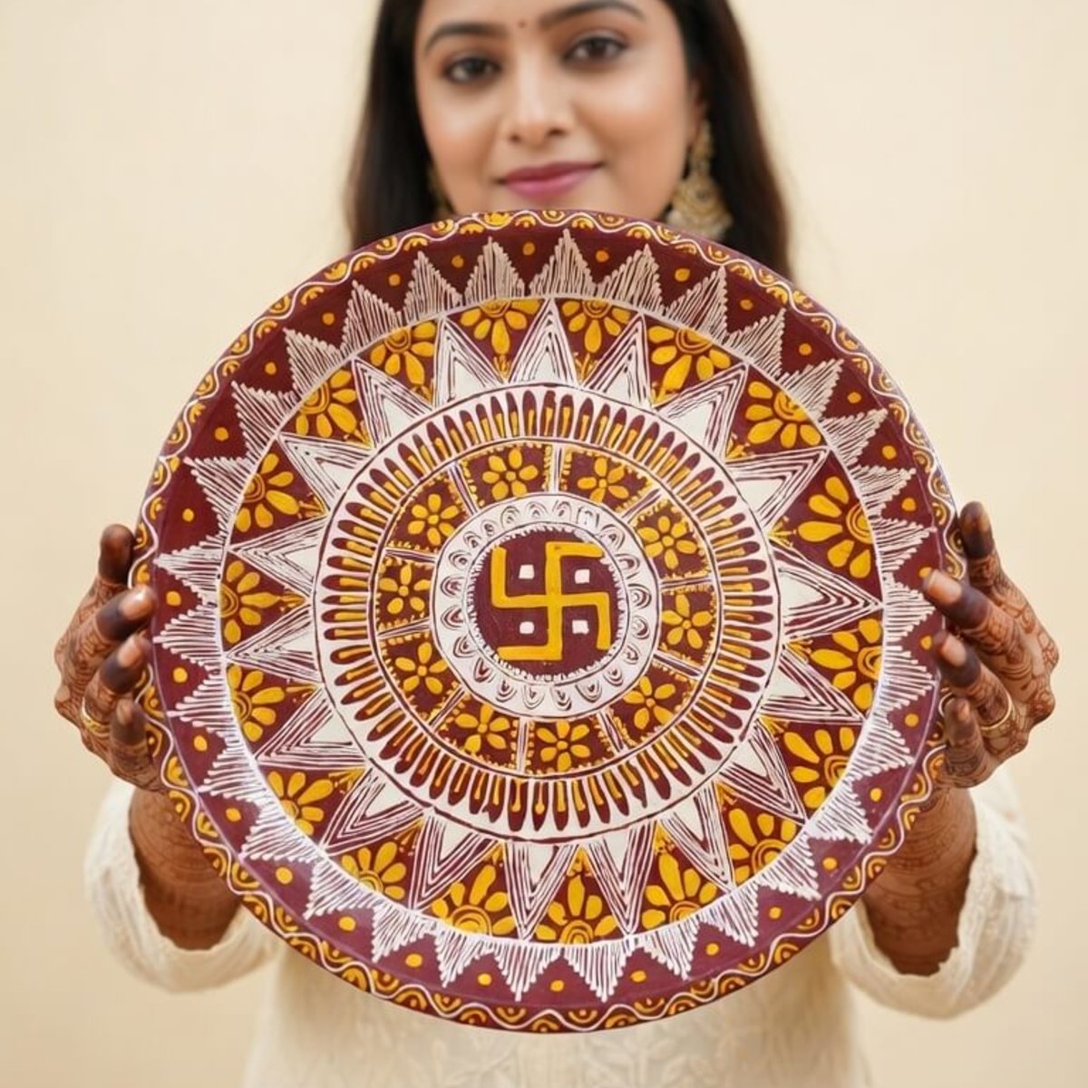 Pahadi Aipan Art Thali ek traditional Kumaoni folk art se inspired handcrafted decorative thali hai, jisme sundar red, white aur yellow colors ka circular design aur swastik symbol bana hua hai. Ye thali pooja, festival decoration, aur wall decor ke liye perfect hai. Iska elegant aur cultural design ghar ko traditional aur attractive look deta hai.