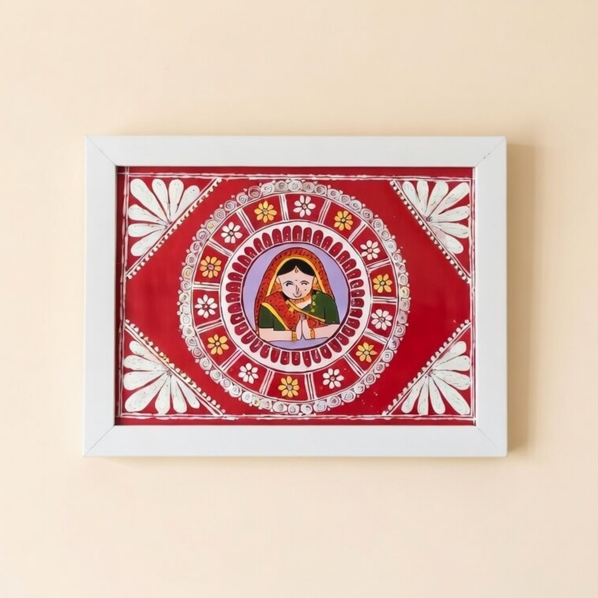 Beautifully handcrafted traditional painting featuring a woman in Namaste pose, surrounded by ethnic floral and geometric patterns. This compact 15cm x 12cm framed artwork radiates peace, devotion, and Indian heritage. Ideal for living room, pooja room, or as a thoughtful gift.